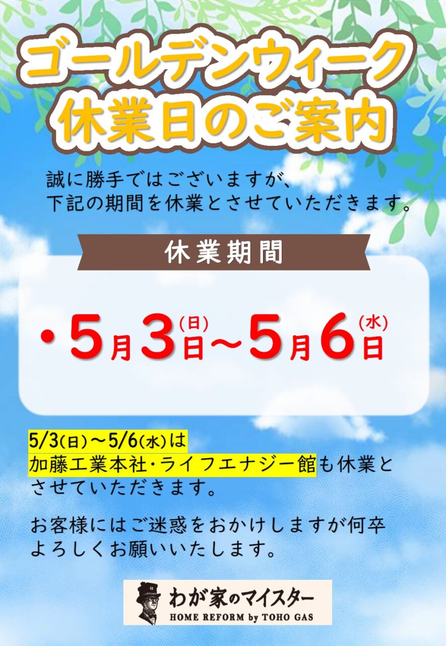 ゴールデンウィーク期間中の営業について 投稿日 2026年4月23日 著者 katokk カテゴリー 新着情報 日頃より弊社をご愛顧いただきありがとうございます。 ゴールデンウィーク期間中の営業について下記の通りご案内申し上げます。 お客様にはご迷惑をお掛けいたしますが、何卒ご理解とご協力のほどよろしくお願いいたします。